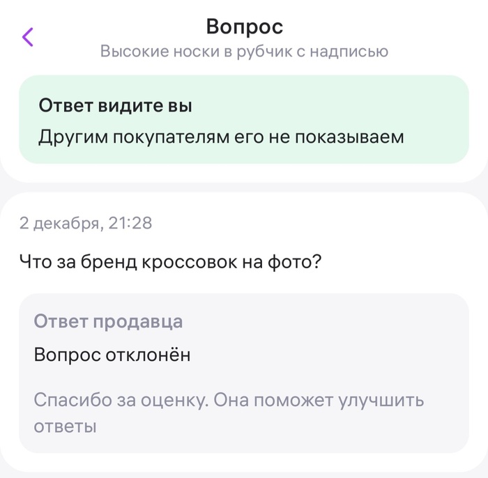 Однако, продавец вместо того, чтобы воспользоваться этим преимуществом, проигнорировать или как-то косвенно уйти от ответа, предоставил ответ, который вы видите. Это просто смешно, учитывая, что администрация WB не заметила ничего страшного в моём вопросе, раз пропустила его.