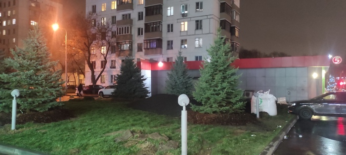 И так вот, иду я тут и вижу что где раньше был островок грязи, теперь стоят ёлочки. Красиво, спору нет. А после я замечаю что всю эту красоту будет освещать пол дюжины прожекторов.