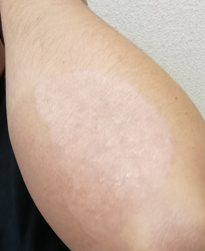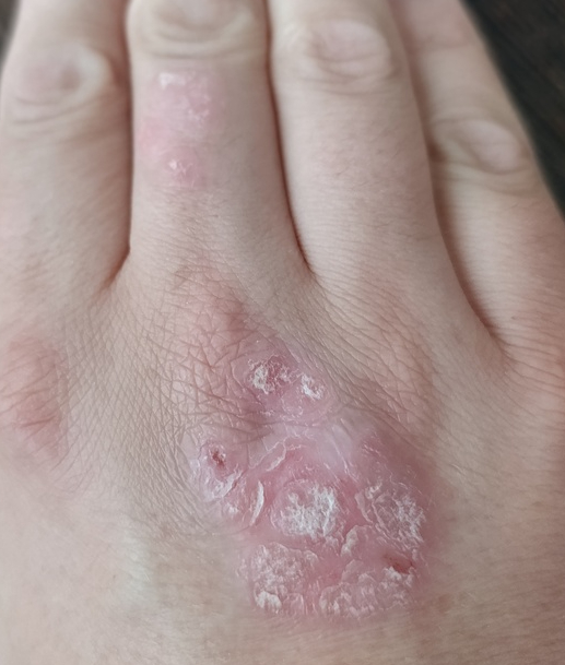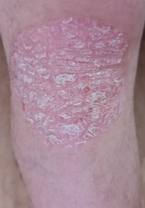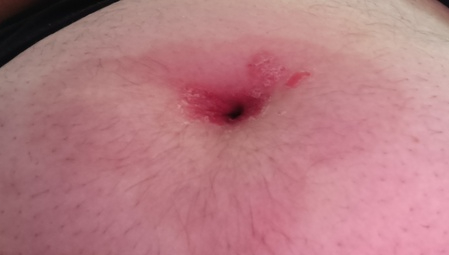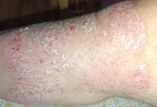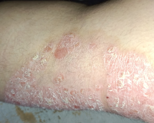 Впервые проявился 5 лет назад, в виде незаживающего стертого пятна под коленом. Вначале не придавал этому значения, но спустя много месяцев рана не заживала, а затем стала увеличиваться. За несколько лет воспаление стало прогрессировать, количество мест поражения ширилось, располагаясь классически, под коленями, на внешней стороне бедер, ягодицах, пупке, ушах и за ними, в прошлом году добавились руки.