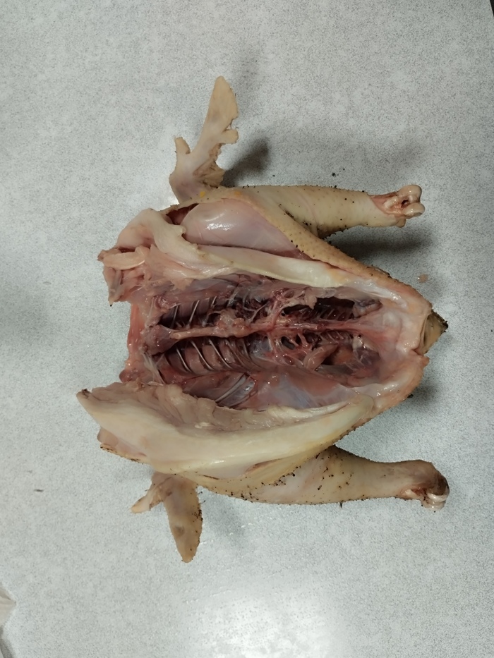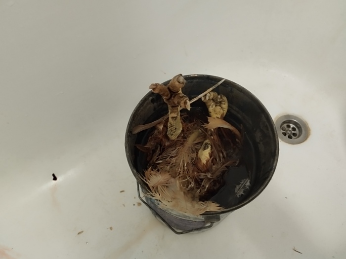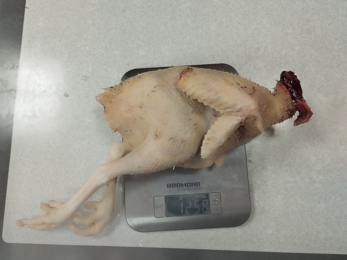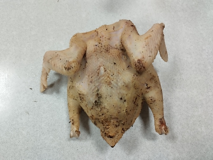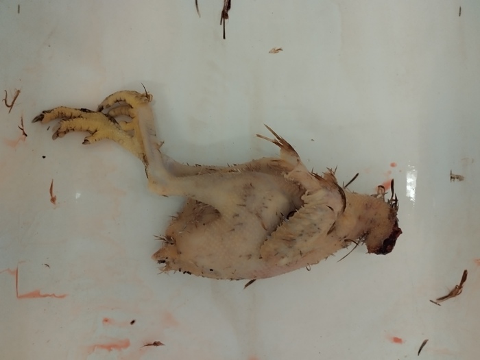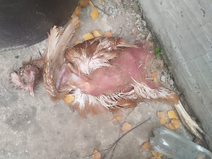 Тушка курицы была частично ощипана, то ли её белые заклевали, то ли своей смертью померла, непонятно.