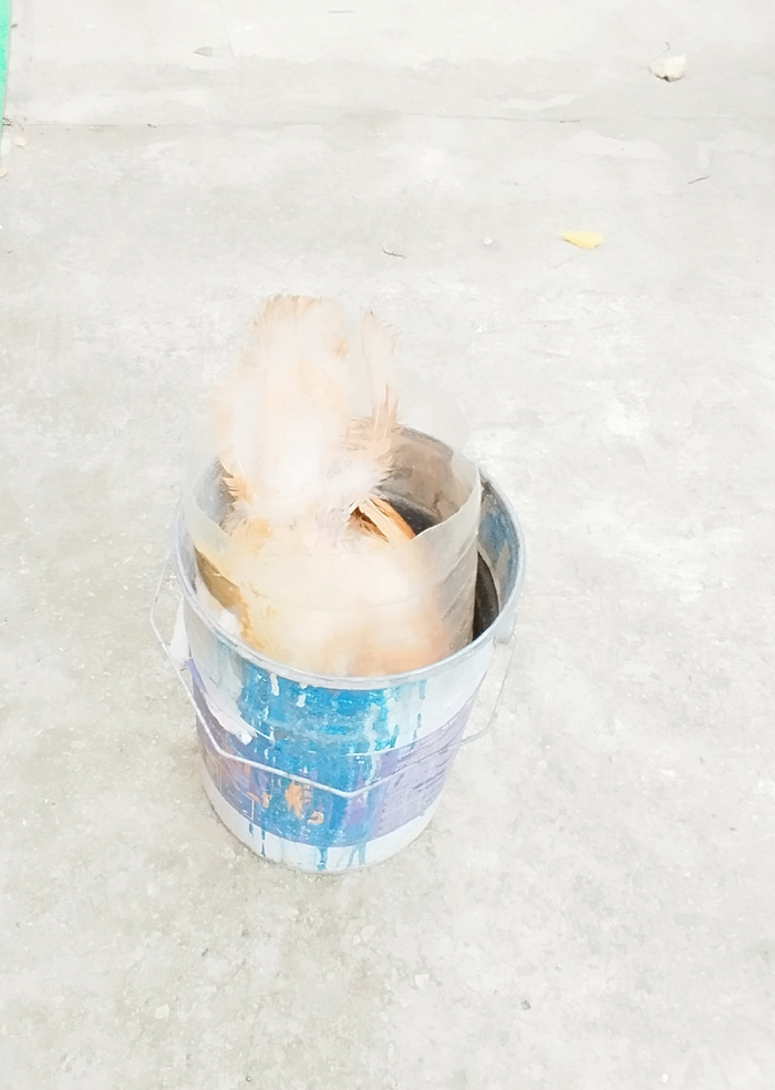 Через 5 минут кровь стекла и курицу можно ощипывать.