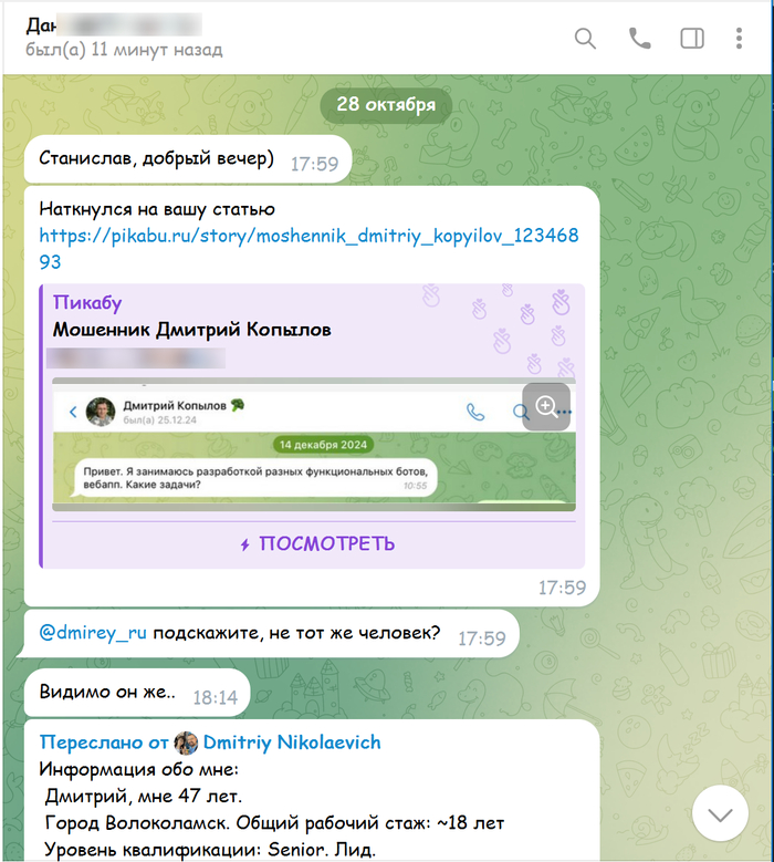 Первый пострадавший — нашёл мой пост, скинул переписку. Та же схема: «Привет, я занимаюсь разработкой разных функциональных ботов, вебапп. Какие задачи?». Спрашивает про ник @DmiRey_ru — не тот ли человек. Тот.