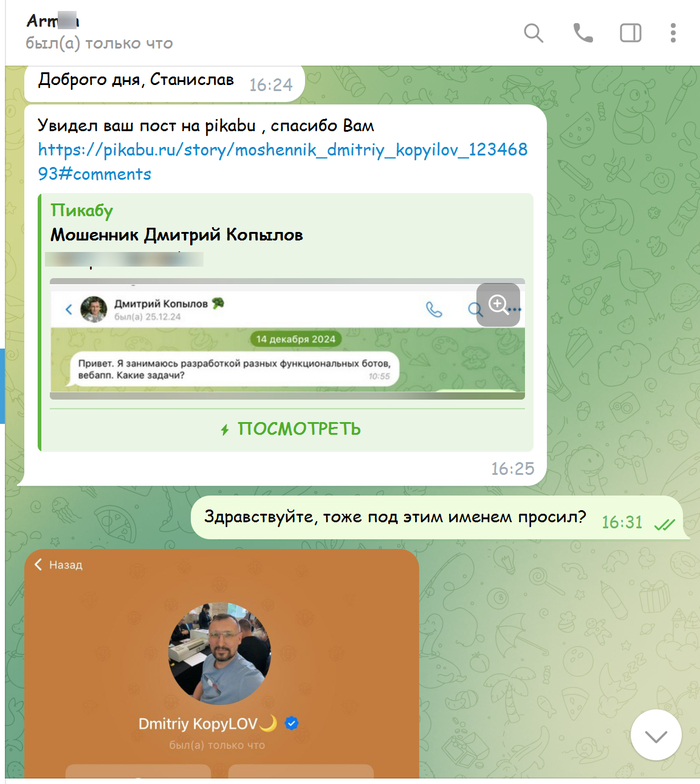 Четвёртый — скинул профиль «Dmitriy KopyLOV» с галочкой верификации. К нему персонаж тоже заходил с предложением разработки.