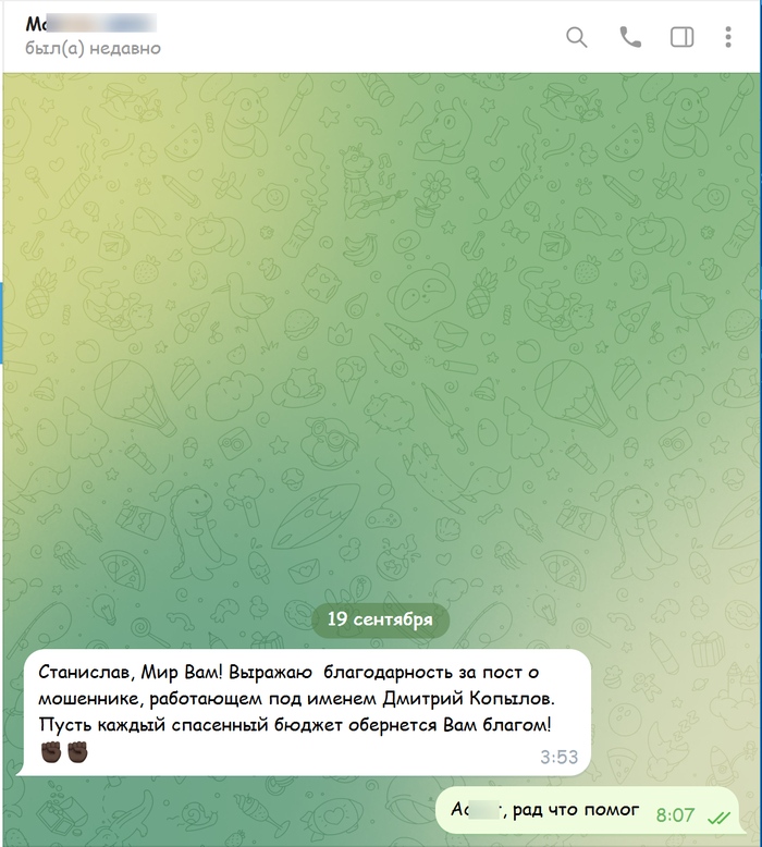 Третий — написал в сентябре: «Выражаю благодарность за пост о мошеннике. Пусть каждый спасённый бюджет обернётся Вам благом». Не попался — успел загуглить.