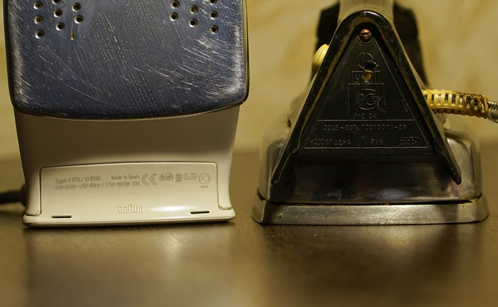 На первый взгляд кажется, что эти два утюга из разных эпох: Первый (Braun si6590) будто прилетел из космоса, второй же (УТП - 1000) сошёл с экрана классического нуара 50-х годов, где им роковая блондинка размозжила голову своего мужа - тирана. Но на самом деле первый утюг всего лишь на 3-4 года младше второго. Справедливости ради - нужно отметить, что данный УТП-1000 - копия американского утюга Mary Proctor, и как долго его ещё выпускали мне не известно. Braun же - куплен в 2005 (6) году, и на прилавках был тоже продолжительное время (по западным меркам), очень уж удачная модель получилась, несмотря на появляющуюся тенденцию к планированному устареванию, несколько раз падал без последствий, оставался включенным, но секрет живучести прост, вода из-под крана у нас хорошая, накипи не даёт.