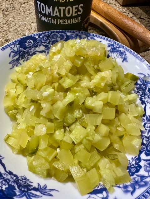 5 огурцов, я порезал в итоге, затем высыпал к морковно-луковой пассеровке.
