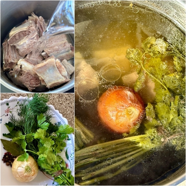 Сразу скажу, что бульон я сварил из говядины. Ну никак почки «не заходят», что называется. Так что, как обычно. Томил рёбра говяжьи пару часов, добавив луковку и «зелёный» букет, да кореньев для бульона полезных.