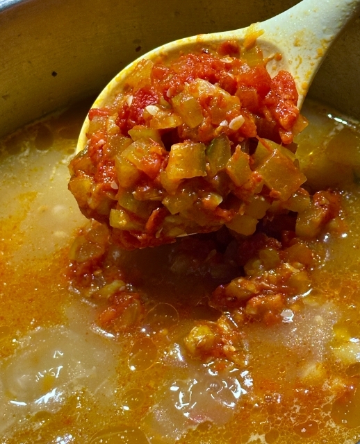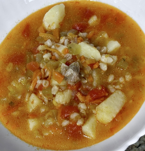 3️⃣ Собираем суп: добавляем перловку, картофель, зажарку и специи. Варим до готовности.
