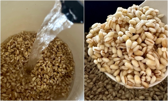 Во-первых, хорошо промыл её проточной водой. В семи водах, что называется. Пока не исчезла муть. При промывке будет выделяться большое количество пены из-за мучнистости крупы. В перловке много крахмала, вот и нужно постараться его вымыть максимально. В общем, идеально добиться прозрачной воды без пены.