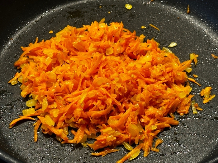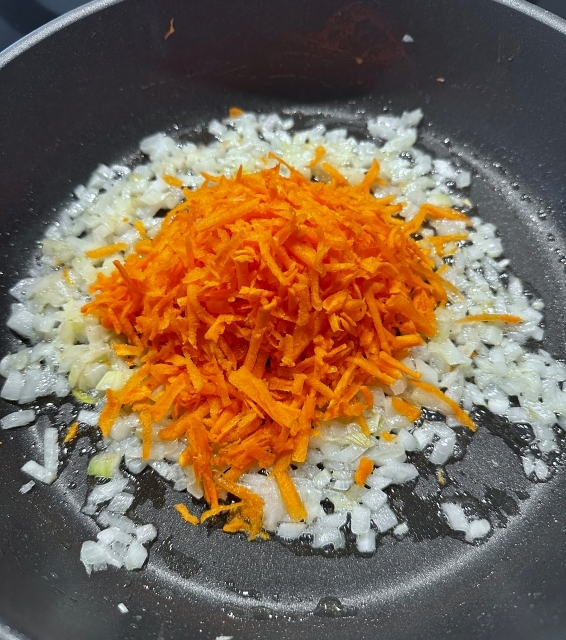 Лук мелко нарубил и в буквально одной столовой ложе растительного масла прогрел. Именно прогрел до начала предпрозрачности. И сразу же добавил натертую на крупной тёрке морковь.