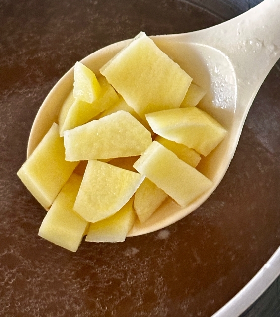 Картошка. Вот такими ломтиками нарезал. Бульон довел до закипания и отправил в него картошку. Нагрев убавил, чтобы слегка взбулькивало и … пусть себе картошка варится.