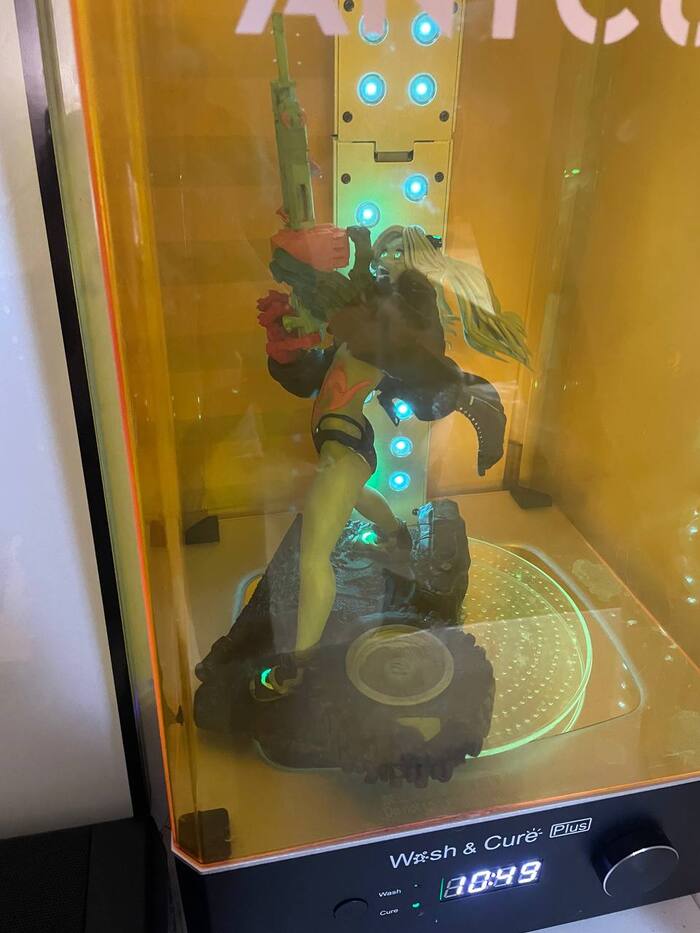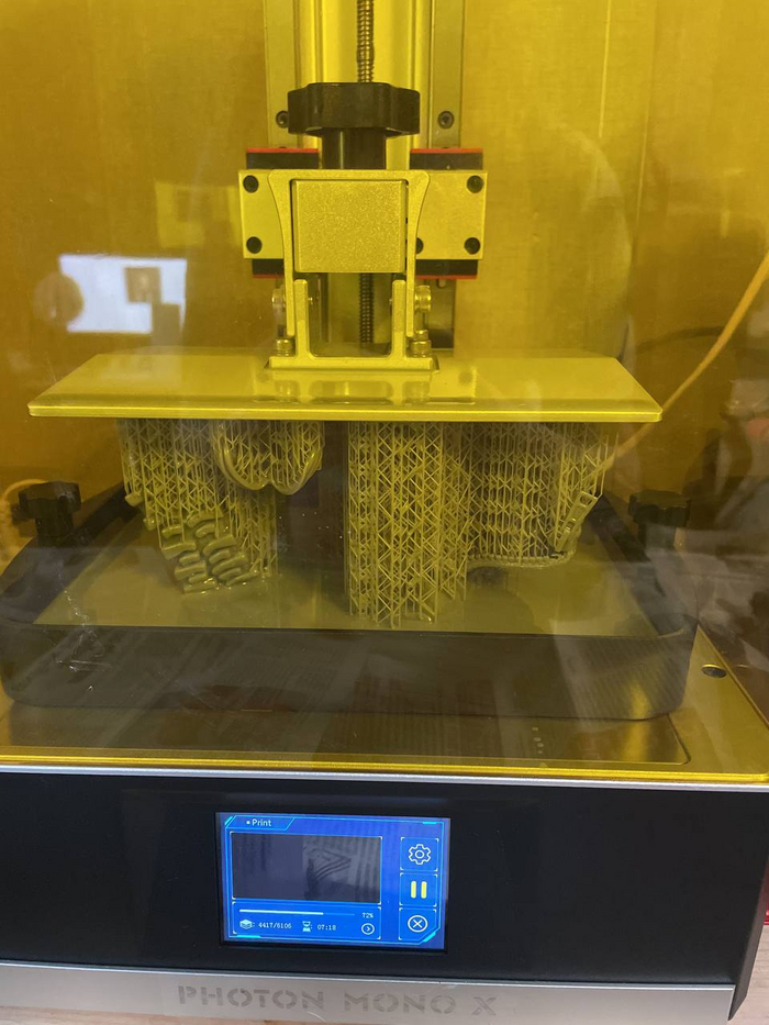 Снимаю все, что напечаталось со стола и сразу же закидываю в ванночку со спиртом. У меня она автоматическая, поэтому я ставлю нужное время и включаю перемешивание. Детали без моего участия промоются, поэтому пока занимаемся другими делами.