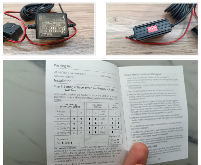 Чтобы настроить кабель, потребуется выбрать несколько переключателей и установить их в нужное положение. Два первых положения отвечают за выбор напряжения работы. 3 и 4 переключатели помогают выставить время работы и последний отвечает за тестирование работы питающего канала. Для понимания на корпусе уже присутствует наклейка с выбором необходимых значений, в бумажном руководстве она дублируется. Для сохранения аккумулятора выбрал значение напряжения до значения 12.2В и время работы до 24 часов. Можно выбирать другие значения в зависимости от климатических условий и нахождения автомобиля в зоне опасности.