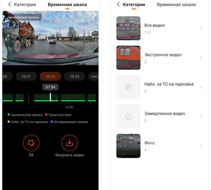 Галерею можно просматривать по отдельному файлу и в дальнейшем загрузить на компьютер или смартфон. Также можно посмотреть по временному отрезку. На изображении будет видно состояние видео. Зеленый цвет — рабочий режим, красный — аварийный.