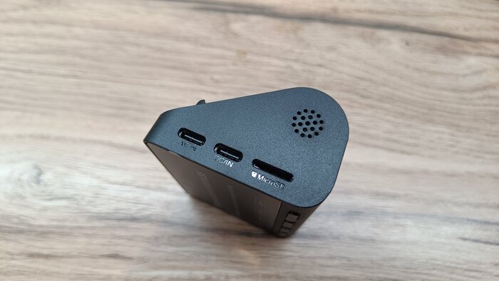 С обратной стороны есть 2 разъема USB Type-C для подключения питания (нижний) и дополнительной камеры (верхний). Надписи назначения выдавлены на корпусе, но в случае неправильной установки ничего не случится. Тут же разъем подключения карты памяти и динамик.