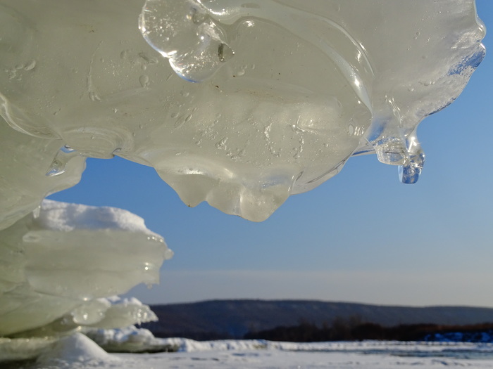 Все свои ледяные находки, я находил, когда ходил с фотоаппаратом по реке Раздольной, что в Октябрьском районе Приморского края. Практически все льдинки, которые я фотографировал, а я именно такие и искал, если присмотреться и включить воображение, что-то или кого-то напоминают. Так что желающие потренировать своё воображение, могут писать в комментах то, что они увидели в льдинках.