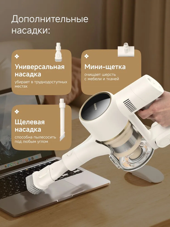 Пылесос оснащен множеством насадок для различных задач. Основная V-образная щетка с подсветкой помогает найти скрытую пыль в затемненных местах, а также удаляет волосы, грязь и другой мусор почти с любого напольного покрытия. Мини-щетка с электроприводом эффективно собирает шерсть животных с мебели и тканей. Универсальная и щелевая насадки подходят для уборки в труднодоступных местах.