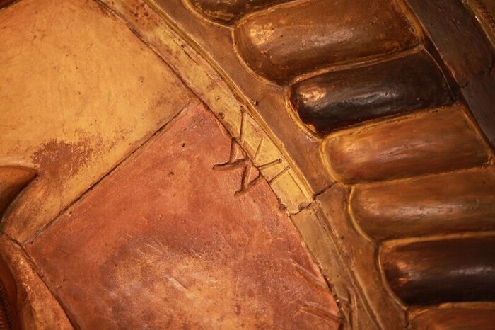 Поскольку изначально икона была на фасаде, эти метки были незаметны. Но потом к храму пристроили галерею и икона оказалась в интерьере. Прямо перед глазами зрителя.