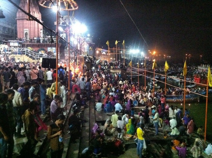 Начало церемонии мы наблюдаем издалека. Сидим на плите свесив ноги. До гхата метров 300 и самого действия нам не видно. Только толпы людей и скопившиеся вдоль гхата лодки, почти перекрывшие реку и превратившие ее в зрительный зал. На противоположном берегу людей кажется еще больше, они стоят широкой полосой, растянувшейся метров на 100.