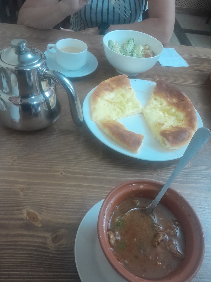 Конечно насладится всем по дольше нас ограничевало время экскурсии,сделали вывод что вернёмся ещё, но самостоятельно на несколько дней потомучто много всего интересного и туристические маршруты и музей Россия который тоже входит в стоимость билета канатных дорог ну и просто почилить в горах. Конечно моя супруга как и любая дама потратила деньги на сувениры фотки магнитик итого вышло 2050р. А моя традиция в горах это глинтвейн очень вкусный делают на Розе хутор , но сцуко 450 р, дорого неудержался. Всё попрощались мы с горами поехали на обед где мы себе заранее заказали еду чтоб потом не тратить время на ожидание. Заказали я себе солянку по грузински, супруга цезарь,ну и конечно хачапури и горный чай фото прилагаю, забыл сразу сфотать ,немного схомячили так как были очень голодными)))