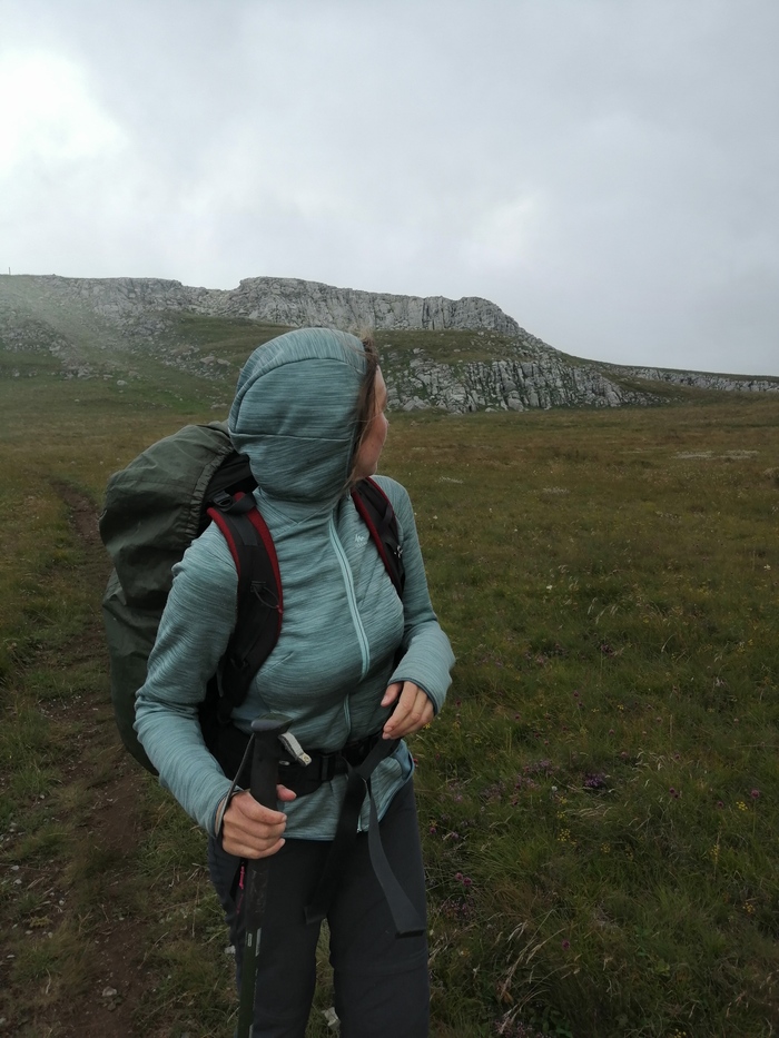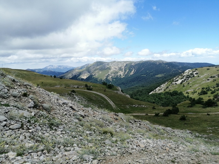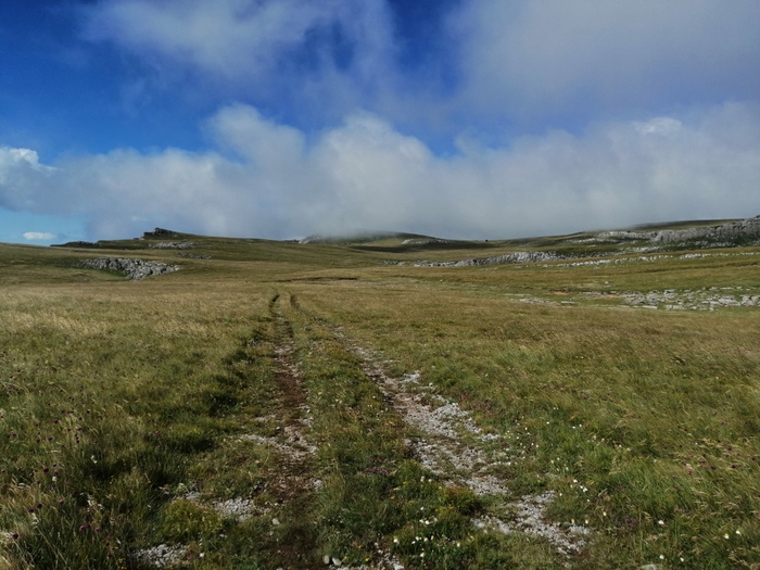 Шли в низине между вершинами, то вверх, то вниз, если бы не редкие облака с материковой стороны Крыма на уровне глаз, сложно было бы сказать, что мы идём на высоте 1400-1500 метров над уровнем моря, но не смотря на это виды все равно потрясающие.