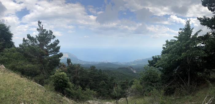 Немного поплутав по бурелому вышли на тропу и довольно бодро (к 11:30) вышли к Гурзуфскому седлу (~1250 м). Тут развилка на беседку ветров и Роман-Кош, а также шикарный вид с одной стороны море и Аю-Даг (гора медведь) с другой необъятная часть материкового Крыма.