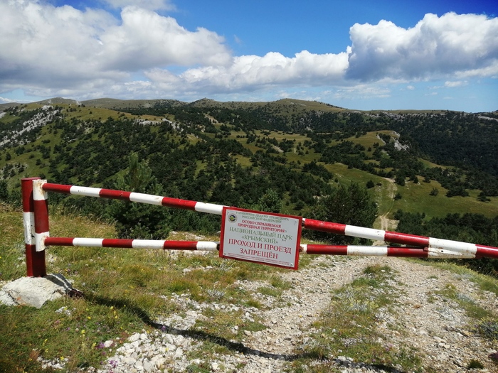 12 июля решили штурмовать самую высокую точку Крыма - Роман-Кош (1545 м). Стартовали в 7:40 из Краснокаменки (215 м) командой из 4 человек (3 мальчика и 1 девочка). Приключения начались 20 минут спустя, пройдя к началу туристической тропы нас настигли лесники и заявили, что вход на территорию заповедника категорически запрещён, вопрос решился 2ух километровым крюком.