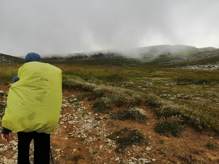 Начинаем спуск и тут же встречаем двух местных мужчин, они собирали тут лиммоник и другие травы, оба в камуфляже и с огромными пакетами трав. У них выяснили где ближайший источник и как быстрее выйти к трассе, удивление вызвало то, что один из них шёл в обычных сланцах по тропам с россыпями осколков горной породы с такой легкостью с которой мы не могли себе позволить идти в своих кроссовках.