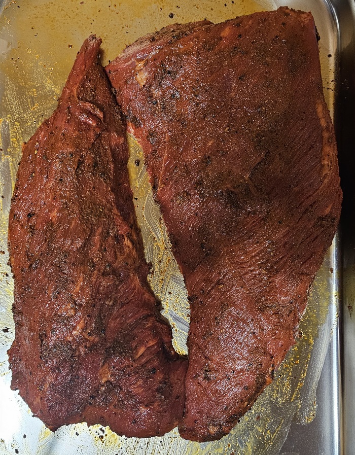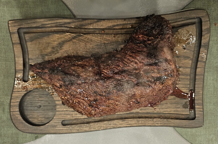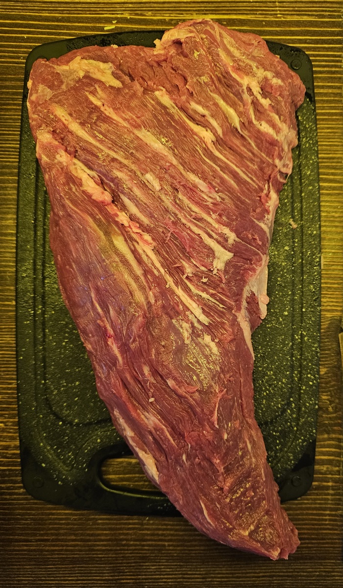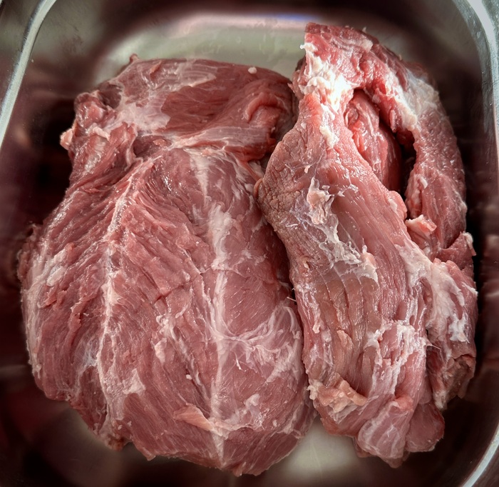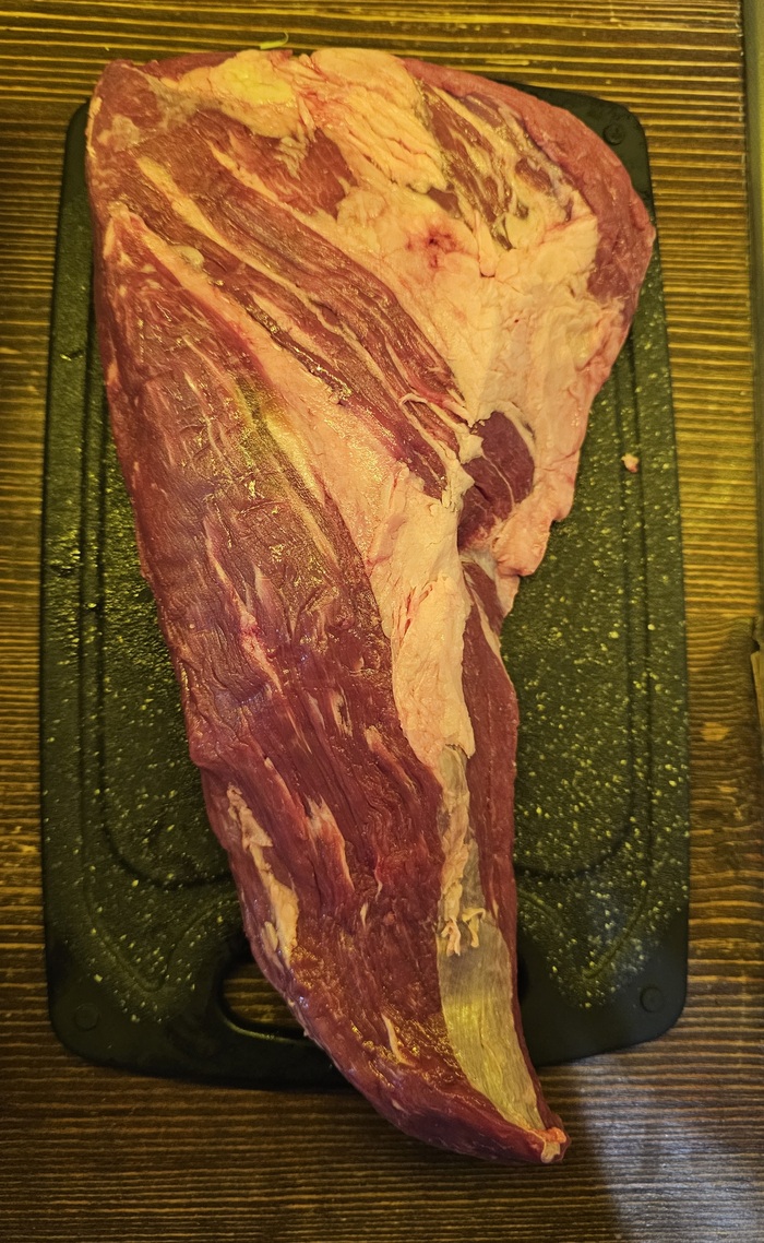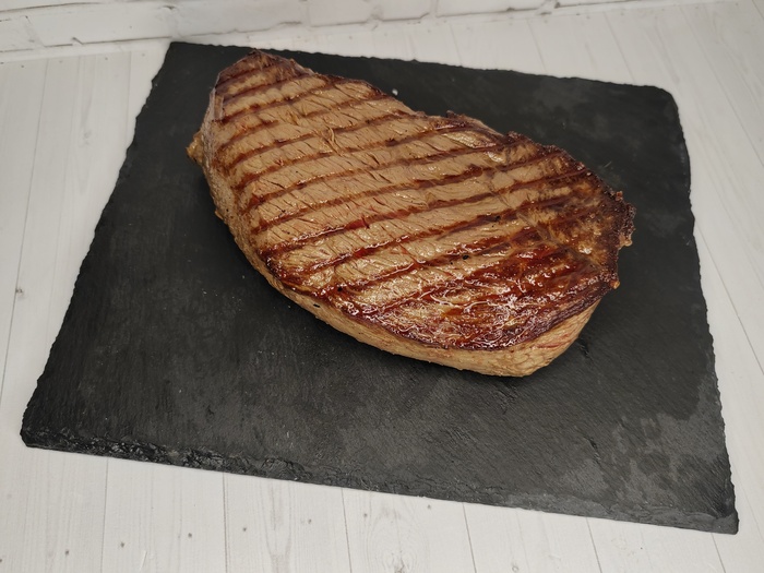 Счищаем с мяса все пленки и обрезаем лишний, болтающийся жирок: у меня сегодня была телятина с небольшим уровнем мраморности, потому жир серьезно не срезал, только тот что выступал за габариты основного куска.