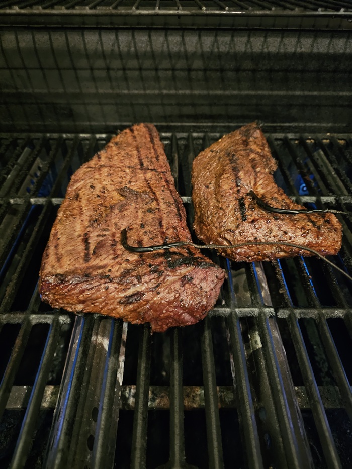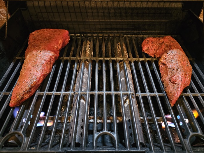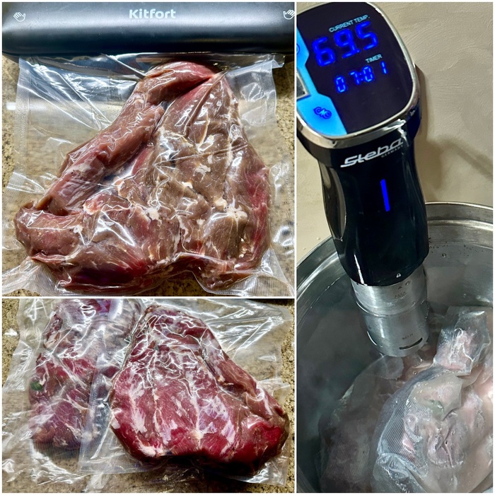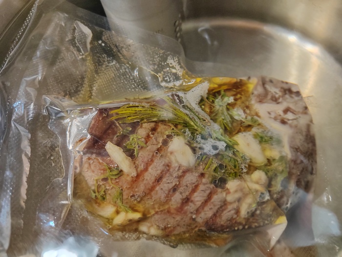 Растапливаем сливочное масло, лучше на гриль-сковороде, но не принципиально, доводим до максимума температуру и кидаем наш кусок на нее, по минуте с каждой стороны и можно чуть-чуть запечатать хвостики? торцы? нашего кусочка, после чего убираем мясо в тару, "отдыхать", ему нет смысла, потому что и так отдохнет в пакете, а нам пора доставать вакууматор: