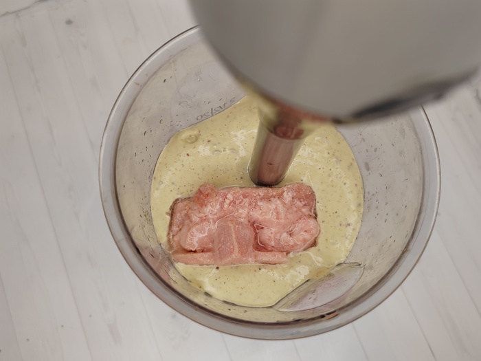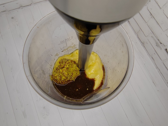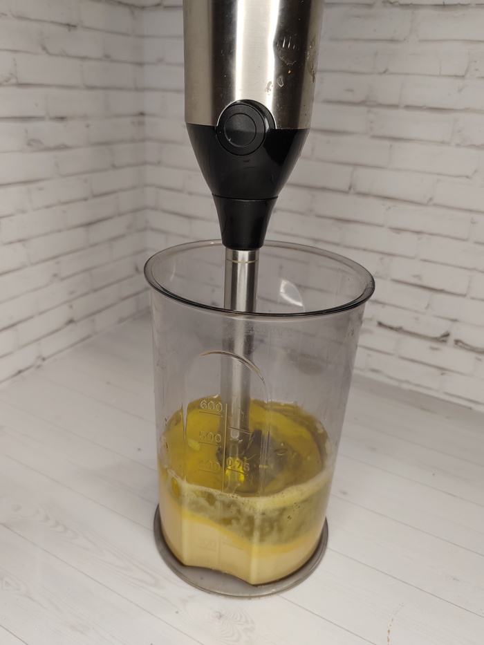 Опускаем блендер в чашу на самое дно, и стараясь не шевелить им, и ни в коем случае, не поднимать! Начинаем взбивать соус на максимальных оборотах.