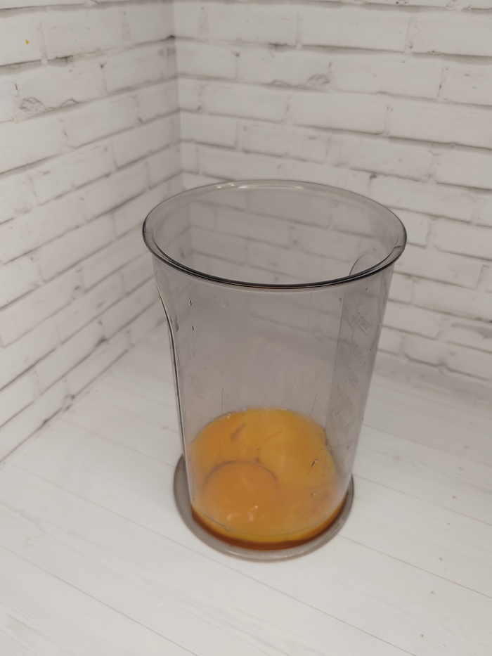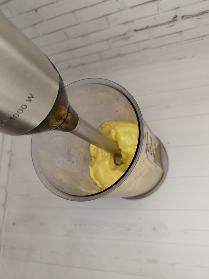 Внимание: может занять какое то время и снизу смесь начнет густеть и напоминать майонез, тут самое важное: не шевелим и не отрываем блендер от дна посуды пока майонез не покроет весь венчик блендера, после чего не снижая скорости вы можете приподнять его, поболтать емкость и дать маслу спуститься ниже, через несколько таких итераций, вы получите домашний и очень густой майонез, это то что нам и нужно.