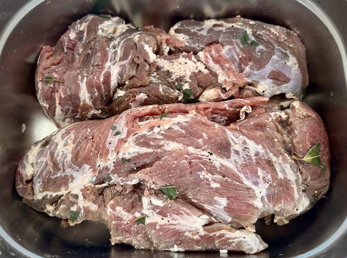 По сигналу шайтан-машины, достаем мясо из емкости, закидываем быстро охлаждаться, идеально кастрюля со льдом, если нет льда просто под ледяной водой, после чего закидываем в холодильник