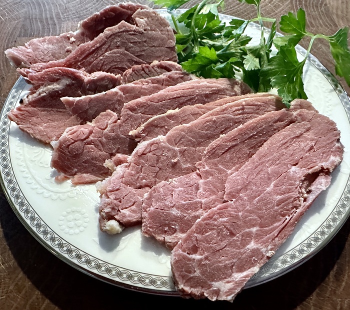 Достаем из холодильника наш вителло(ростбиф) и нарезаем его тонкими кусками, посмотрите какая красота у нас вышла...