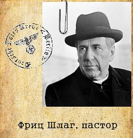 С одной стороны он "пастор" (что характерно для протестантов). Но с другой стороны в гестаповском деле он фигурирует как "католический священник" ("дело на Шлага Фрица католического священника дата ареста 23/VI — 1944 обвиняется в антигосударственной деятельности и покушении на фюрера"), но католический священник называется не пастор, а ксендз. Ещё загадка - Папа Римский принимает пастора Шлага у себя в Ватикане как единоверца... Одевается пастор Шлаг как и положено протестантскому пастору в сюртук с белым воротничком (сутаны не носит), но также в фильме показано как он играет на органе, что, как бы, более свойственно католикам...