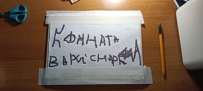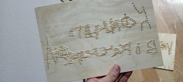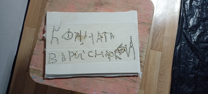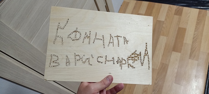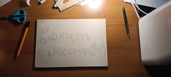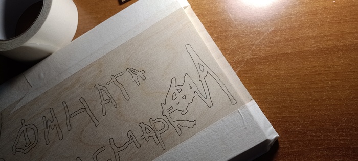 Начал я с того, что перенес надпись с сохранившегося фото стены на отрезанный по размеру лист фанеры. Сам шрифт предварительно сделал чуть жирнее, чтобы с ним было удобнее работать, да и из соображений внешнего вида.