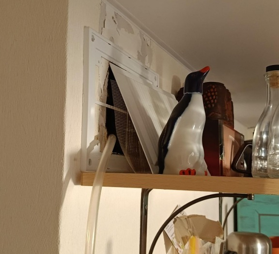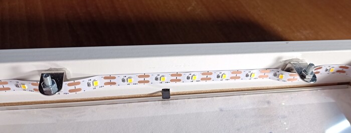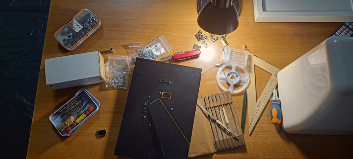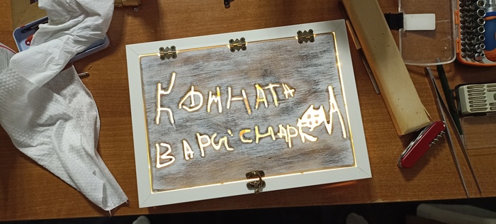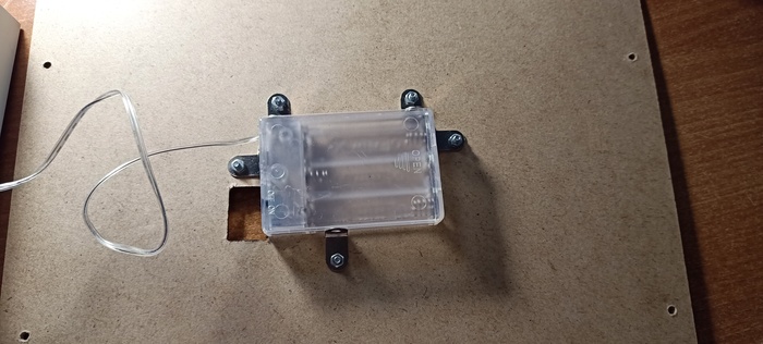 Пока краска сохла, решил заняться задней стенкой рамки. В изначальной конструкции она прилегала к стеклу, поэтому пришлось сколхозить крепеж так, чтобы между стеклом и стенкой было пространство для батареек и диодной ленты. Решил сделать это все при помощи маленьких мебельных уголков. В самой стенке пробил небольшое оконце, чтобы можно было просунуть палец и включить свет.