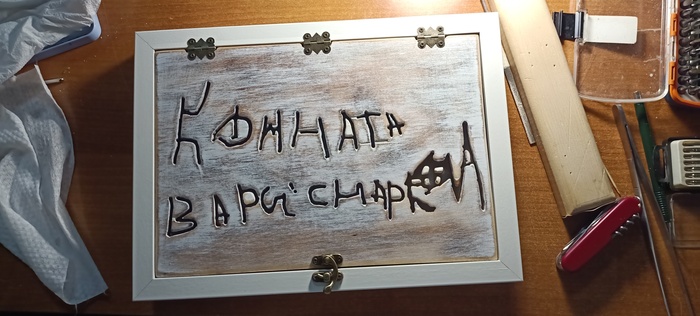 Когда краска высохла, снова обработал заготовку наждачкой до состояния побитой временем деревяшки и сделал небольшие пазы под петли. После чего обработал поверхность маслом для деревянной мебели.