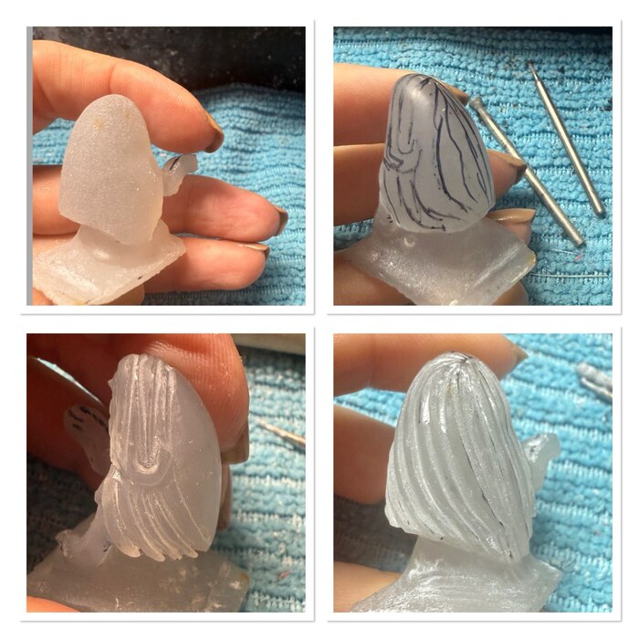Общие очертания готовы, перехожу к волосам: сначала выравниваю и пришлифовываю поверхность, размечаю и вырезаю прядку за прядкой. Потом каждую прядку нужно будет выровнять и отшлифовать
