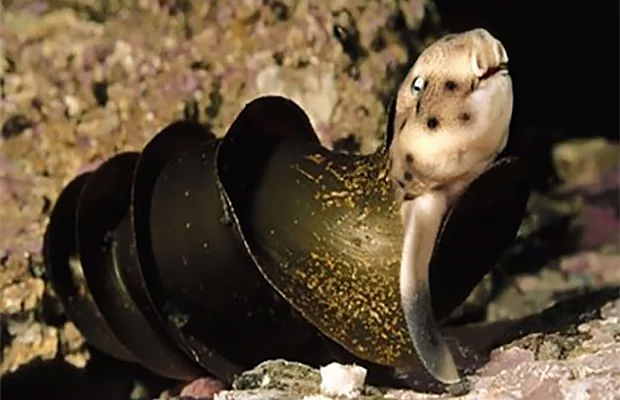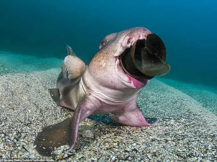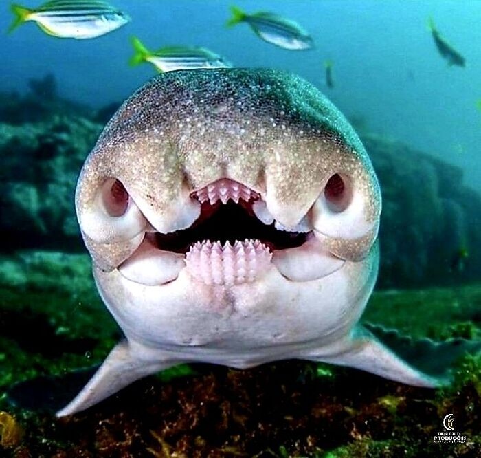 Такой ротище позволяет ей есть абсолютно всё: рыба и головоногие моллюски режутся на флажки передними, острыми как бритва, зубами, а твёрдая добыча, типа крабов, иглокожих и раковинных моллюсков, крошится в труху задними большими и плоскими зубищами. Мимо подводной бычары не проскользнёт никто, ведь обоняние у неё будь здоров – вы только посмотрите на этот нос!
