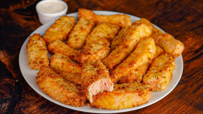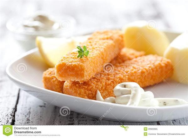 Разнообразить свое меню очень просто — приготовьте рыбные палочки в кляре! Это блюдо не только вкусное, но и полезное. Готовить очень легко и быстро. Для рецепта вам потребуется: — 1 мелко натертого картофеля — 500 г нежирной рыбы — 1 небольшая луковица — 1 зубчик чеснока — 1 столовая ложка дижонской горчицы — цедра лимона — 2 столовые ложки мелко нарезанных листьев петрушки — 2 яйца — 125 мл молока — 150 г пшеничной муки — 200 г панировочных сухарей — подсолнечное масло — 30 г сливочного масла Приготовление: Смешайте картофель, рыбу (фарш), лук, чеснок, горчицу, цедру лимона, петрушку и немного соли и перца в миске, затем разомните, чтобы хорошо перемешалось. Сформируйте из смеси 12-15 маленьких палочек около 6 см длиной. Положите их в холодильник на 20 минут. Взбить яйца и молоко вместе в неглубокой миске. Поместите муку в другую миску и приправьте солью и перцем. Поместите панировочные сухари в отдельную посуду. Опустите рыбные палочки сначала в муку, затем в яичную смесь, а затем в панировочные сухари. Нагрейте около 3 см подсолнечного масла в сковороде на среднем огне. Обжарить рыбные палочки в течение 3-4 минут, переворачивая, до хрустящей корочки и золотистого цвета. Подавать рыбные палочки с салатом.