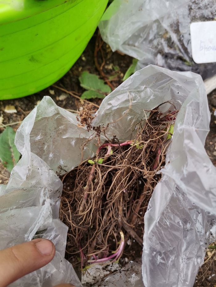 Поясняю. Это отрезки корневищ с почками. В каждом пакета этакий клубочек из корневищ. Это посадочный материао, который был заготовлен в прошлом сезоне и отправлен на холодный склад для хранения.