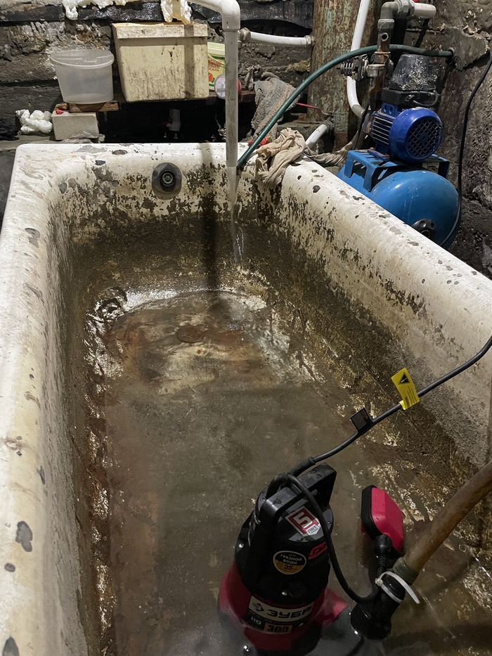 В сентябре месяце этого года в доме моей тещи стали «плакать» стены на цокольном этаже. Пройдя весь участок с той стороны где началось подтопление, я подумал, что теща или дети забыли закрыть шланг для полива и причина в этом. Перекрыв на улице все краны, решили понаблюдать недельку за ситуацией, но ситуация не изменилась. В первую очередь приходит одна мысль, что у нас прорвало трубу, которая входит в дом. Так как тесть умер и мы не знали даже где находится колодец, ни говоря о трубе, какая труба проложена из металла или полипропилена. Взяли металлоискатель и пошли искать колодец (да, колодцы там без крышек, лист металла и засыпаны сверху грунтом) в предполагаемом его расположении. Нашли. Заглянув в колодец и увидев трубу, понял, что проблема не в нашей трубе, так как она была из полипропилена и в обсадной трубе. Да и в колодце все было сухо как и обсадной трубе, которая заходит в дом. Пока разбирались, что это не наш порыв, в один из дней отключали воду почти на сутки, Течь на цокольном этаже дома мой тещи прекратилась. Но когда дали воду, то через сутки стены опять заплакали, но более интенсивно. Было решено позвонить в водоканал и вызывать аварийную бригаду, чтобы они обнаружили течь. В водоканал мы позвонили 1 октября, но специалист водоканала приехал лишь 5 октября. Ну пока ждали специалиста, я сделал отверстие в стене цокольного этажа где течь была больше всего и из стены хлынул поток. Вставили трубу в отверстие и запенили щель между стеной и трубой. Занесли старую ванную в погреб и в нее стала стекать вода из трубы. В ванную опустили дренажный насос и когда ванная наполняется насос срабатывает и откачивает воду. Благодаря этой конструкции теще стало легче, она не так часто стала выносить ведра и собирать воду с пола, которая бежала в больших объемах. Она ее просто даже не успевала собирать.
