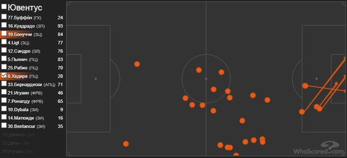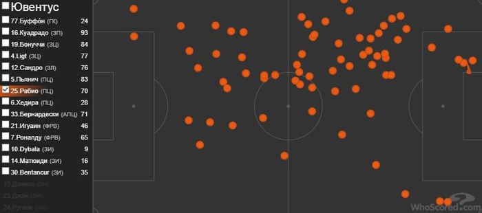 Летом стан «синьоры» в очередной раз пополнили свободные агенты. Один из них, Адриен Рабьо, брался с прицелом на будущее, и сейчас рассматривается скорее как ротация Блезу Матюиди. В преддверии лигочемпионовского матча 14-му номеру была дана некоторая передышка (вышел на 20 минут). Таким образом, ЦПЗ ближе к левому краю вышел Рабьо, а справа, по традиции, Сами Хедира. При этом функции у них сильно различаются. Только взгляните на карту касаний: