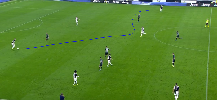 Крейчи опасается оставлять ЛЦЗ 1-в-1 с Игуаином (на случай заброса за спину партнёру), поэтому страхует зону. Сансоне выдернулся прессинговать Куадрадо, не оценив ситуацию. Бернардески получает время принять решение