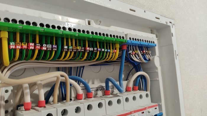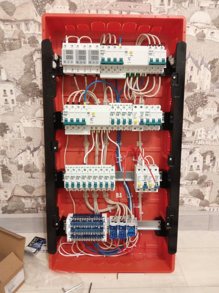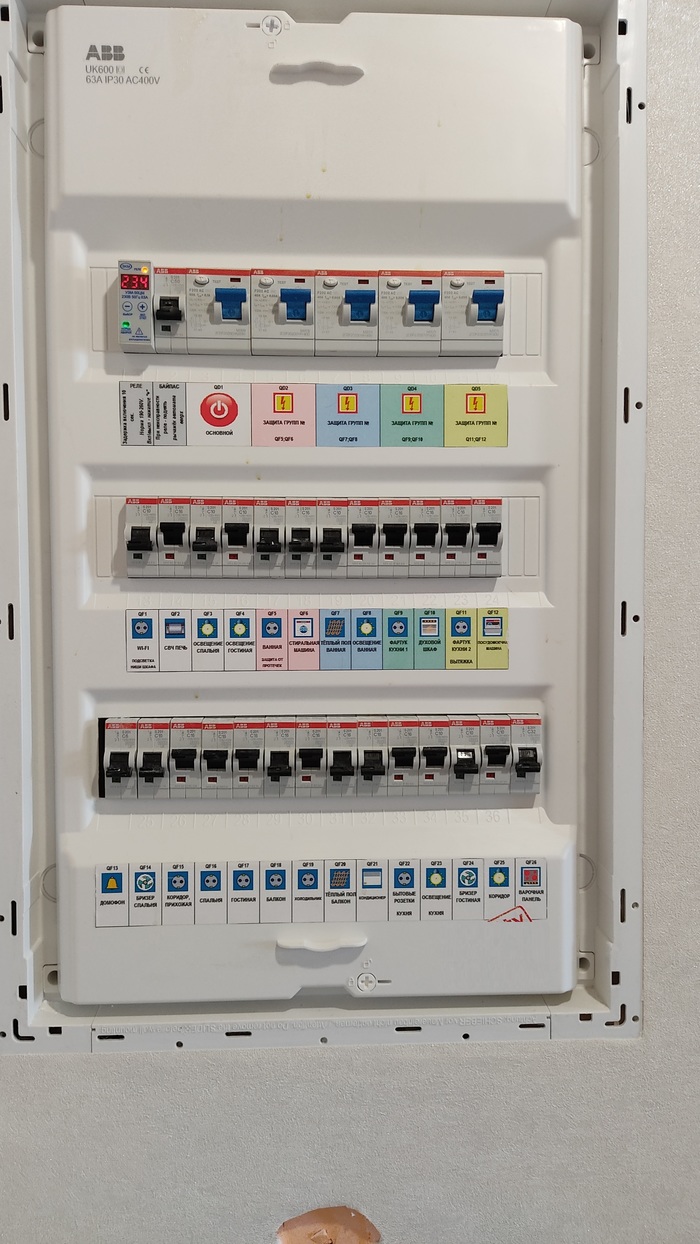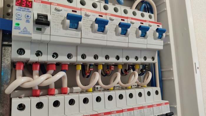 Работа заняла ровно один день. Набор автоматов остался старый, но теперь они подключены правильно. Вот только питание на них пришлось завести снизу, вопреки привычному методу, так как длины проводов уже не хватило бы, чтобы сделать иначе.