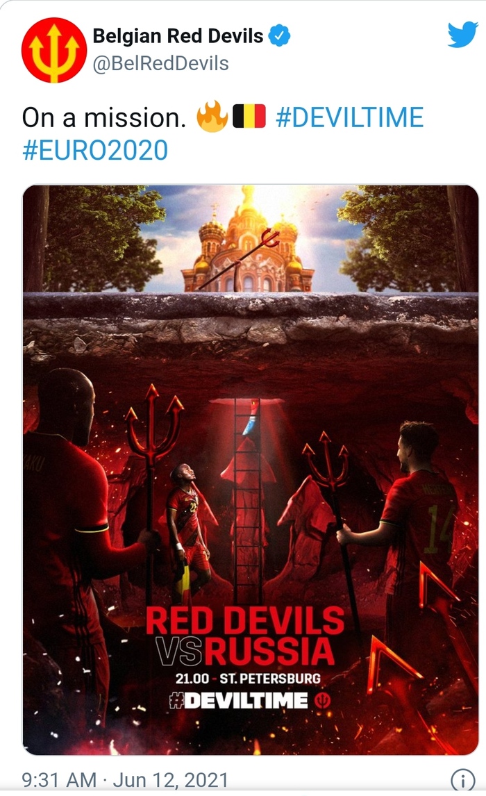 На афише игроки бельгийской команды вылезают из-под земли с трезубцами дьявола, а сверху виднеется православный храм. «На задании», — говорится в сообщении.
