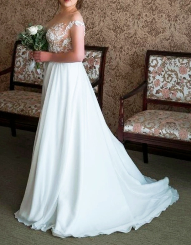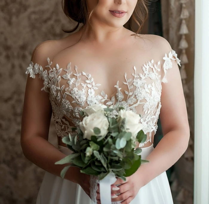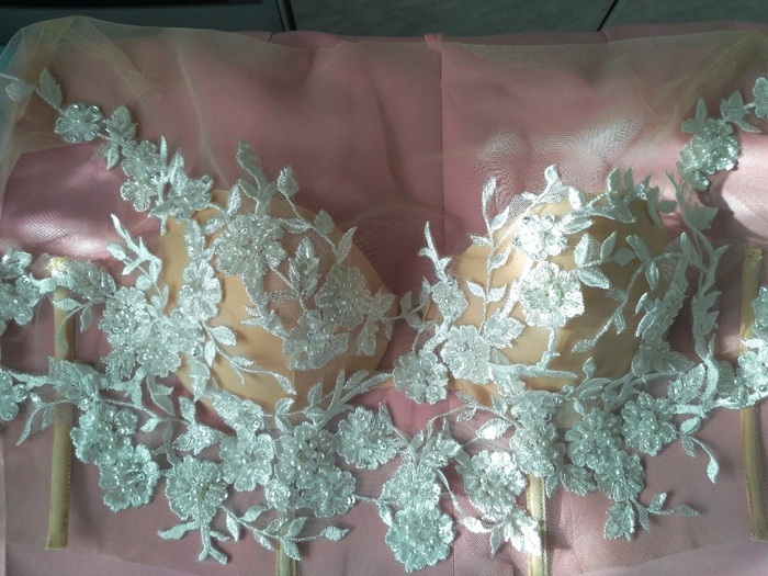 Клиентка попросила сделать похожее платье, но чтобы кружево выглядело более нежным, открыть плечи, сделать сетку максимально незаметной. И чтобы юбка не просвечивала. Тз понятно, работаем.