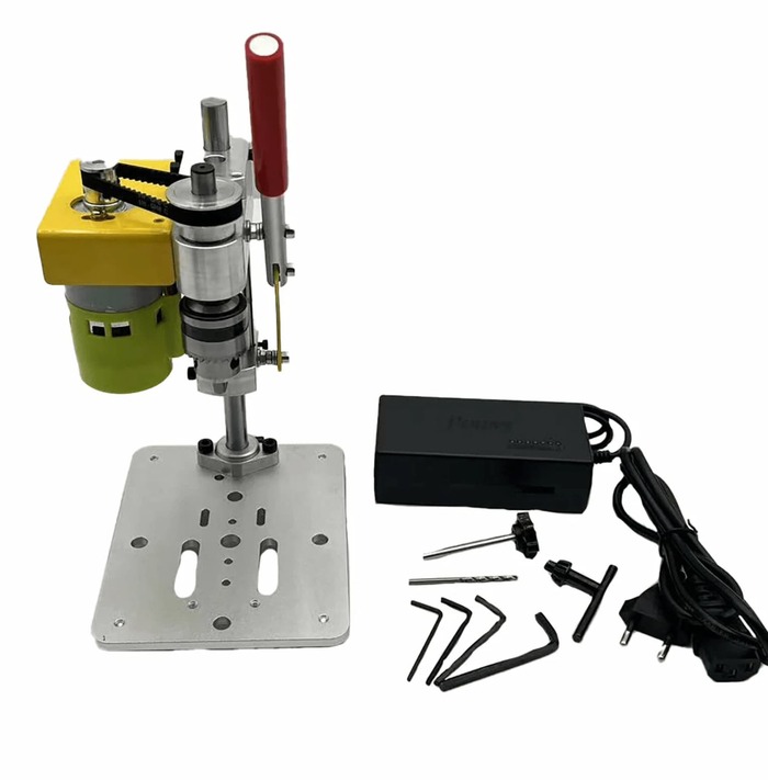 Красивая и миниатюрная металлическая настольная дрель в стиле ретро для сверления ровных вертикальных отверстий на различных изделиях. Стоит такой около 5 500 руб. Ссылка на него. Судя по отзывам, адаптер идёт с плоскими штекерами и потребуется переходник на наши розетки.