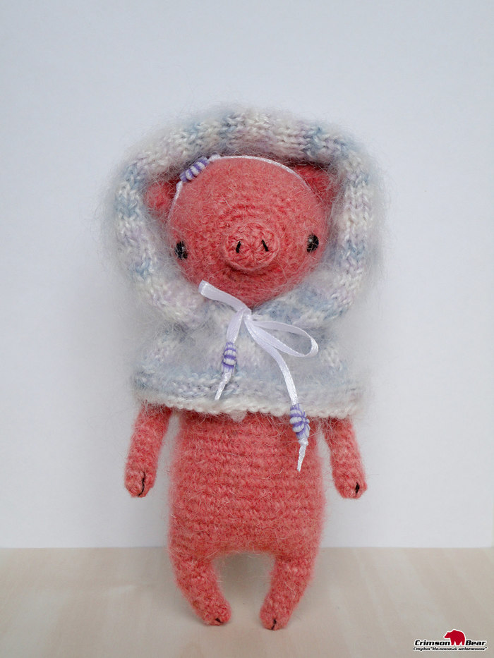 Свинка связанна из шерсти, капюшон - мохер. Размер 16 см. Капюшон надевается на голову свинке, или можно снять его совсем.